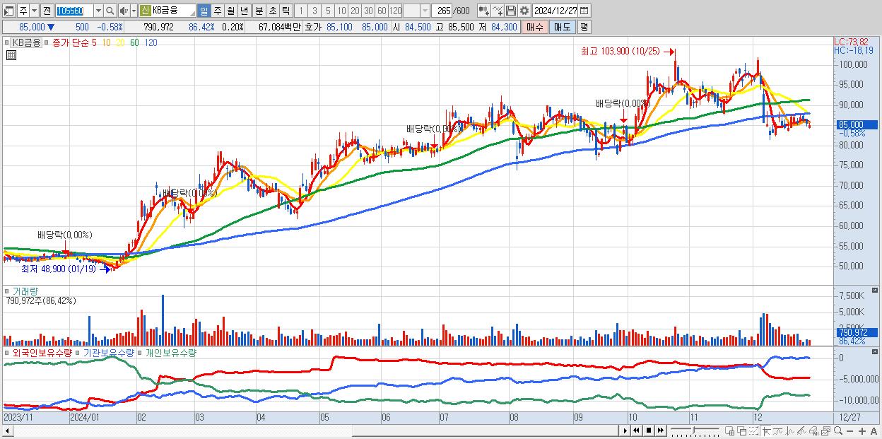 - KB금융 (85,000원 ▼ -0.58% , 시총: 334,499억, 외국인 순매수 거래금:66억)