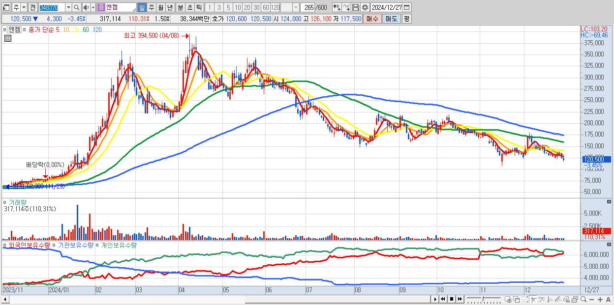 - 엔켐 (120,500원 ▼ -3.45% , 시총: 25,438억, 외국인 순매수 거래금:56억)