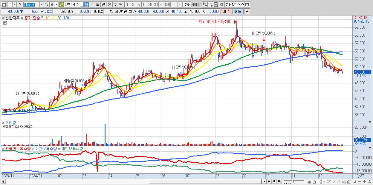 - 신한지주 (48,350원 ▼ -1.12% , 시총: 243,416억, 외국인 순매수 거래금:39억)