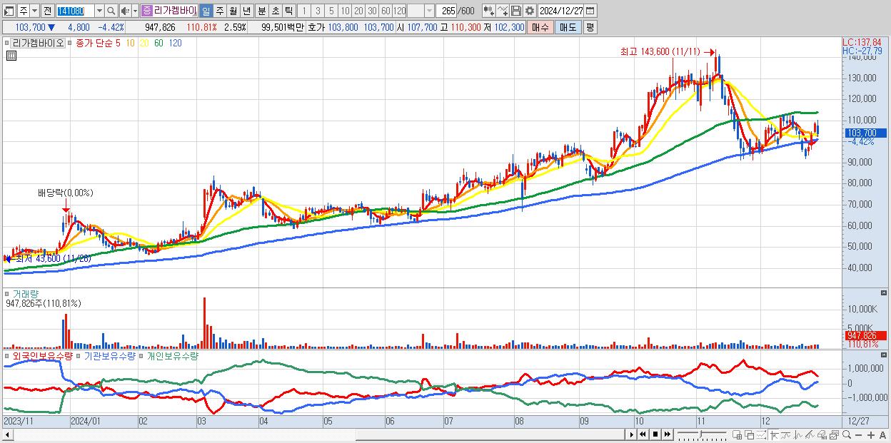 - 리가켐바이오 (103,700원 ▼ -4.42% , 시총: 37,965억, 거래량: 947,826, 거래대금:995억)