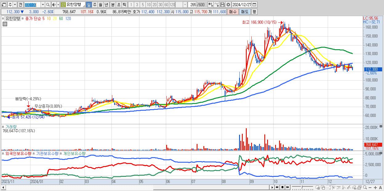 - 유한양행 (112,300원 ▼ -2.6% , 시총: 90,075억, 거래량: 768,647, 거래대금:868억)