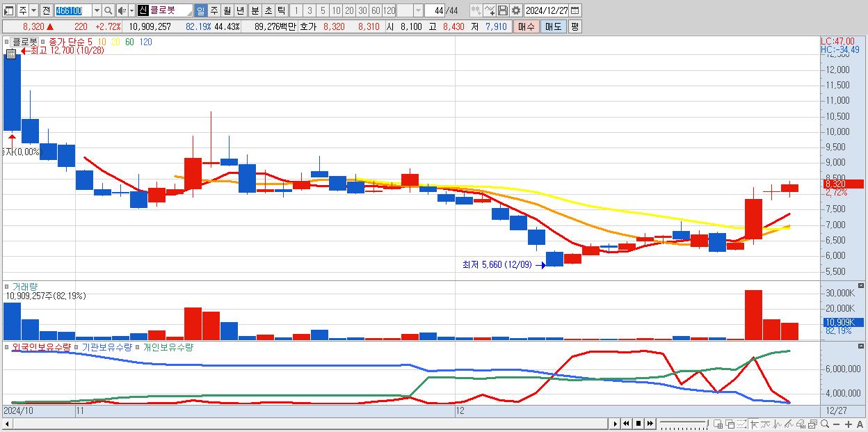 - 클로봇 (8,320원 ▲ 2.72% , 시총: 2,043억, 거래량: 10,909,257, 거래대금:893억)