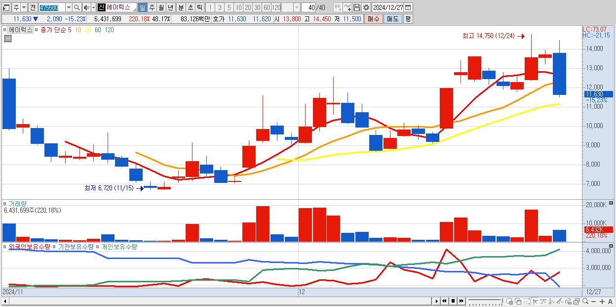 30.에이럭스 11,630원 ▼ -15.23% (KOSDAQ, 475580)