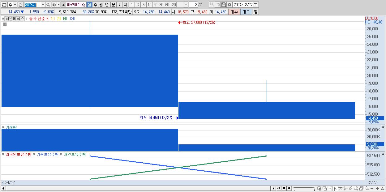- 파인메딕스 (14,450원 ▼ -9.69% , 시총: 813억, 거래량: 9,619,784, 거래대금:1,727억)