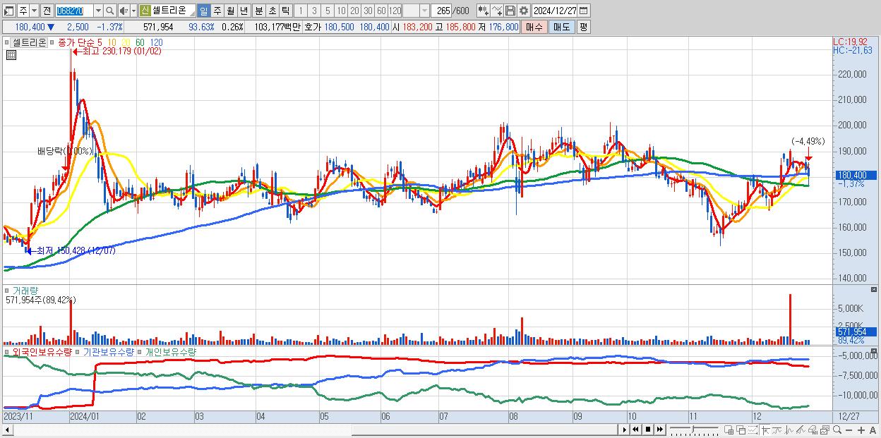 - 셀트리온 (180,400원 ▼ -1.37% , 시총: 391,610억, 거래량: 571,954, 거래대금:1,032억)