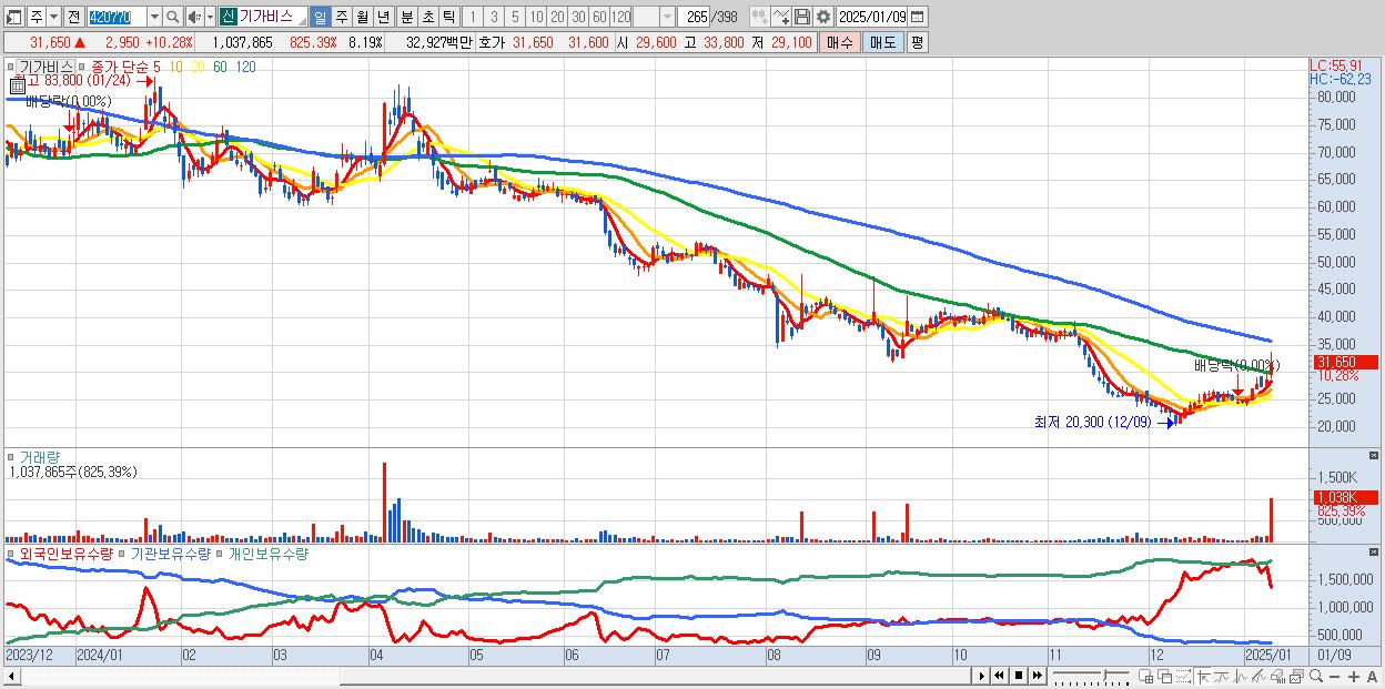 - 기가비스 (31,650원 ▲ 10.28% , 시총: 4,012억, 거래량: 1,037,865, 거래대금:329억)