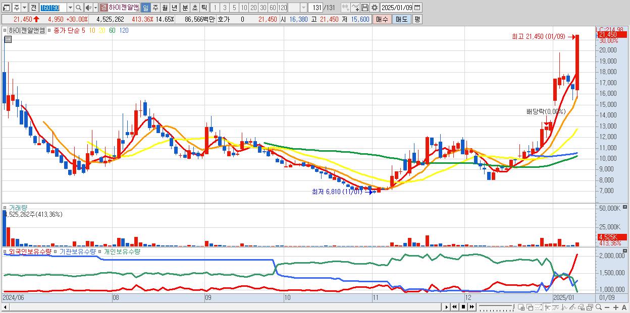 - 하이젠알앤엠 (21,450원 ▲ 30% , 시총: 6,625억, 거래량: 4,525,262, 거래대금:866억)