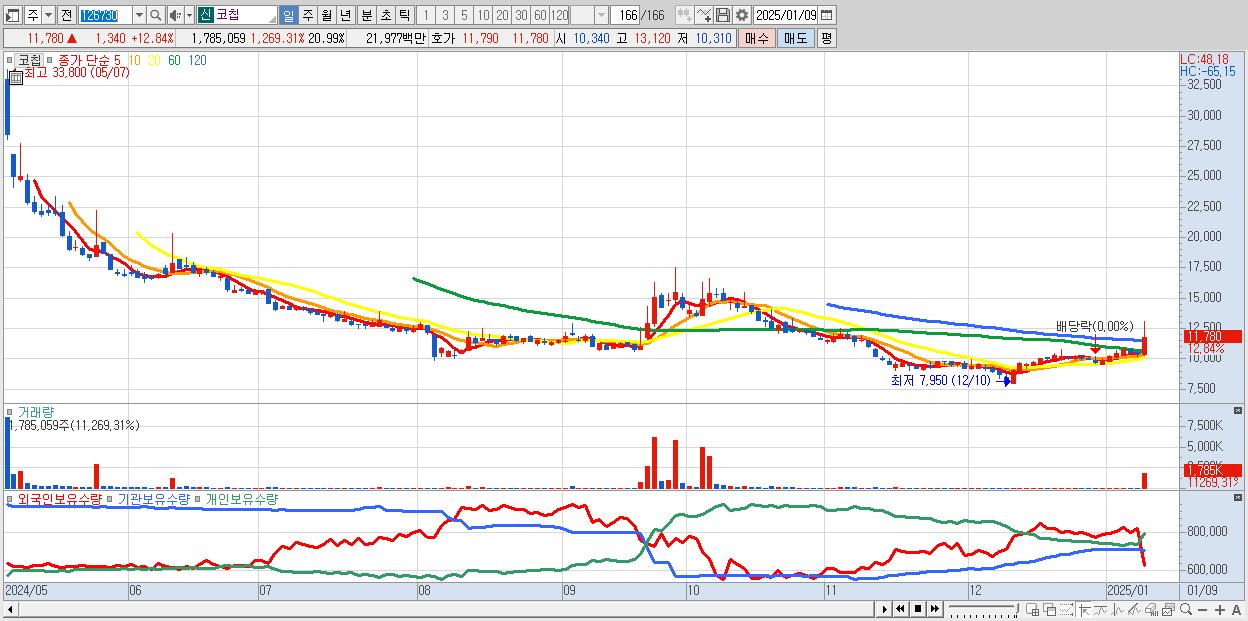- 코칩 (11,780원 ▲ 12.84% , 시총: 1,002억, 거래량: 1,785,059, 거래대금:220억)