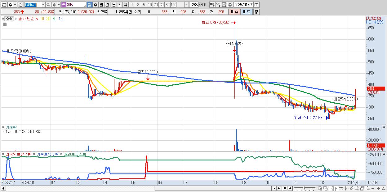- SGA (383원 ▲ 29.83% , 시총: 225억, 거래량: 5,173,010, 거래대금:19억)