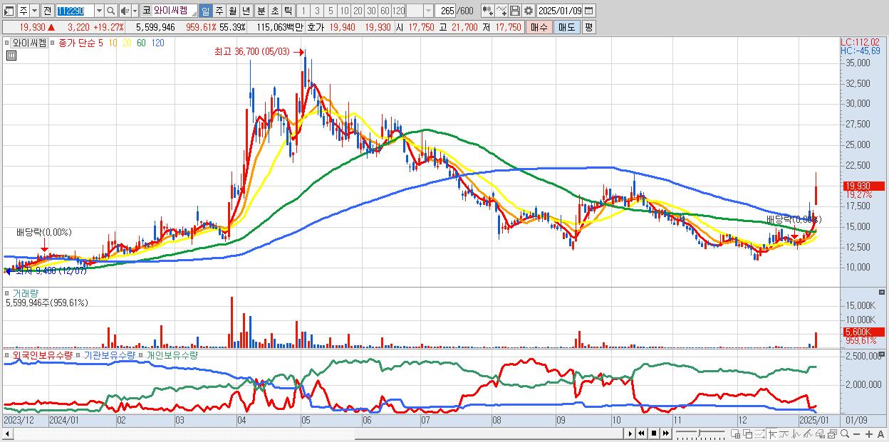 - 와이씨켐 (19,930원 ▲ 19.27% , 시총: 2,015억, 거래량: 5,599,946, 거래대금:1,151억)