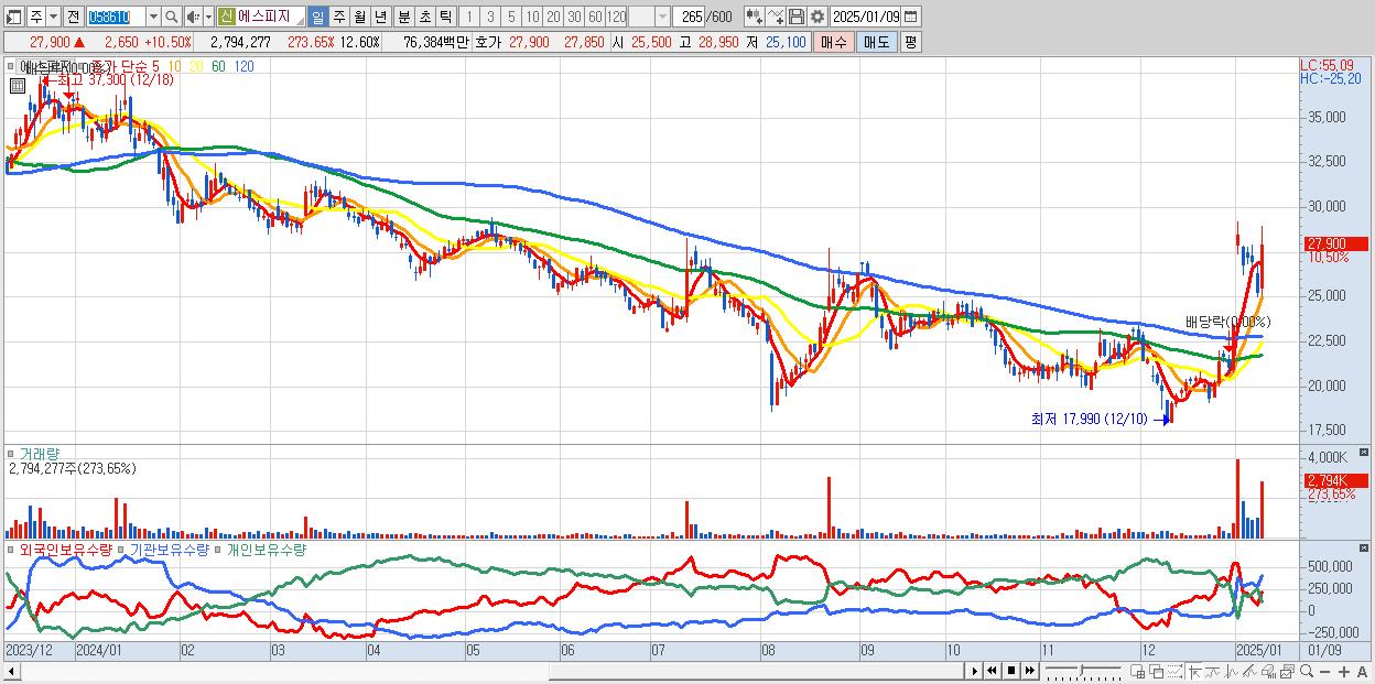 - 에스피지 (27,900원 ▲ 10.5% , 시총: 6,187억, 거래량: 2,794,277, 거래대금:764억)