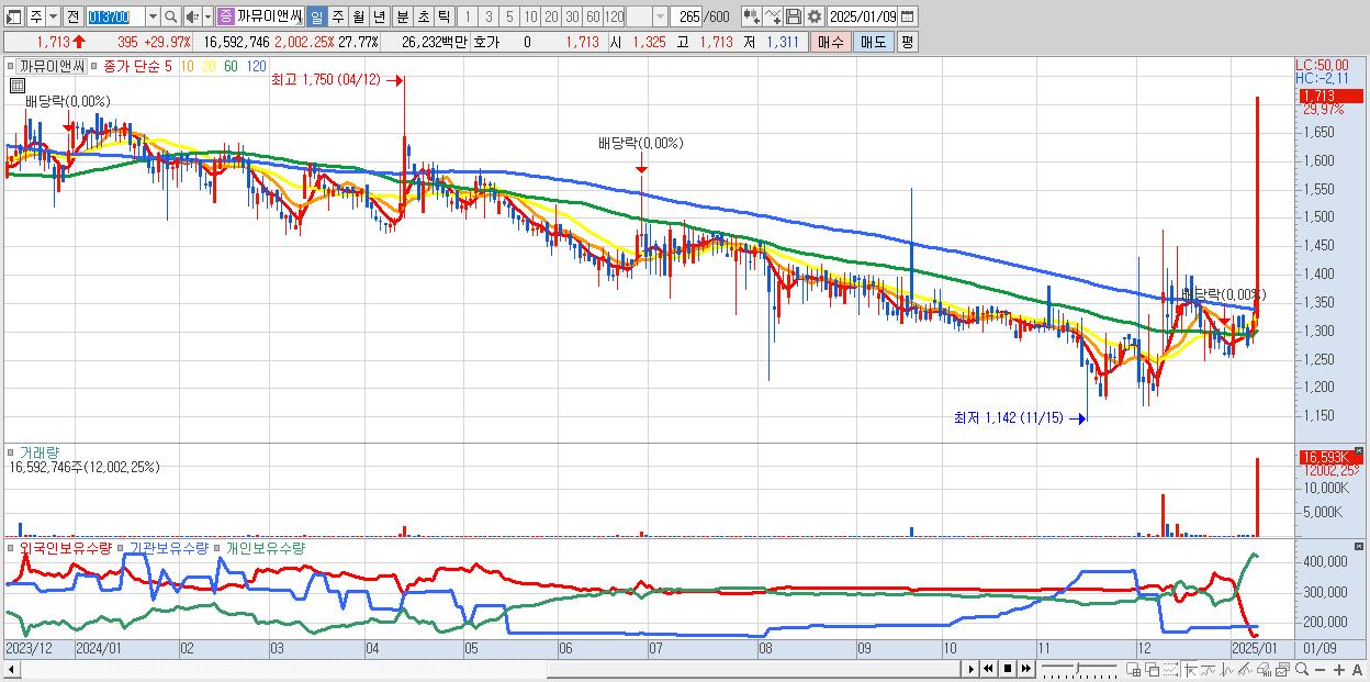- 까뮤이앤씨 (1,713원 ▲ 29.97% , 시총: 1,024억, 거래량: 16,592,746, 거래대금:262억)