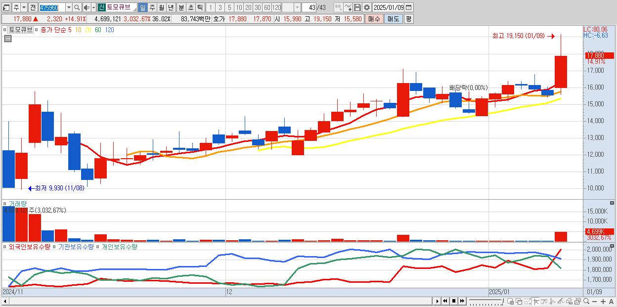 - 토모큐브 (17,880원 ▲ 14.91% , 시총: 2,333억, 거래량: 4,699,121, 거래대금:837억)