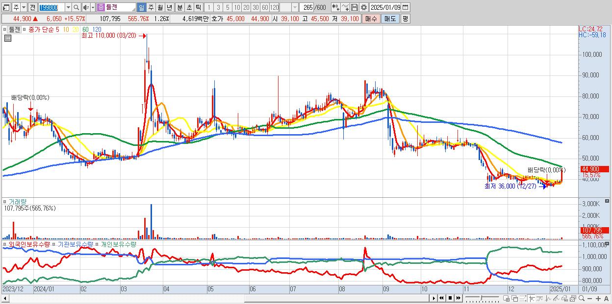 - 툴젠 (44,900원 ▲ 15.57% , 시총: 3,839억, 거래량: 107,795, 거래대금:46억)