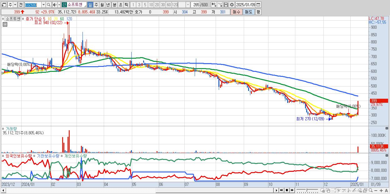 - 소프트센 (399원 ▲ 29.97% , 시총: 421억, 거래량: 35,112,721, 거래대금:135억)