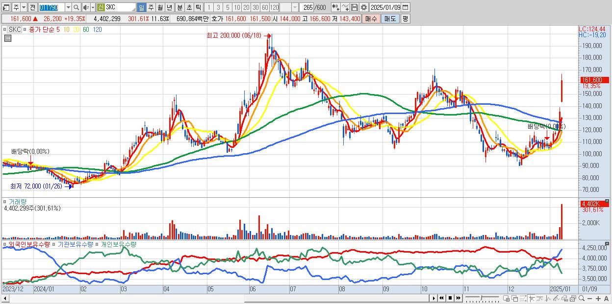 - SKC (161,600원 ▲ 19.35% , 시총: 61,195억, 거래량: 4,402,299, 거래대금:6,909억)