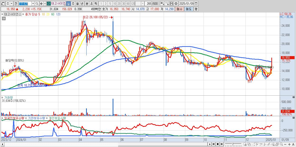 - 테고사이언스 (16,950원 ▲ 15.15% , 시총: 1,374억, 거래량: 31,634, 거래대금:5억)