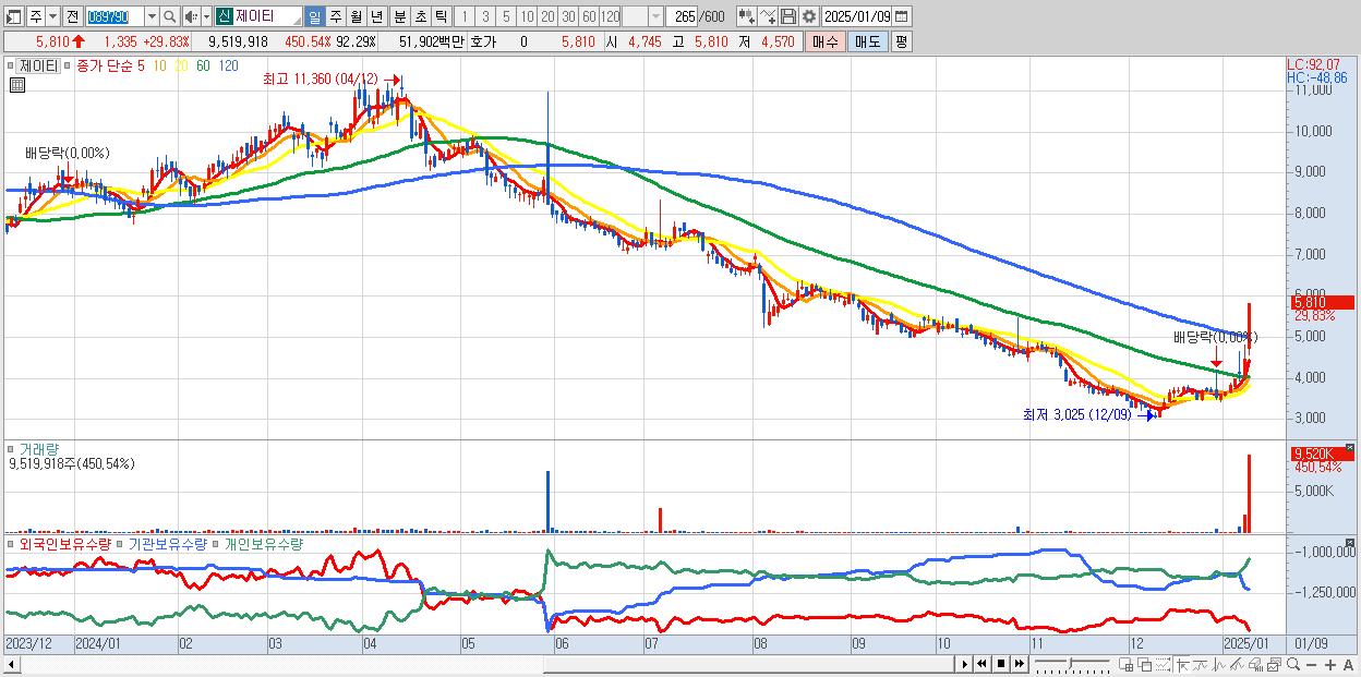 - 제이티 (5,810원 ▲ 29.83% , 시총: 599억, 거래량: 9,519,918, 거래대금:519억)