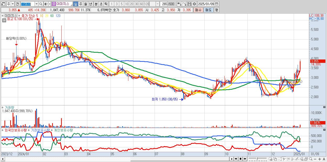 - 이미지스 (3,855원 ▲ 14.39% , 시총: 627억, 거래량: 1,847,400, 거래대금:69억)