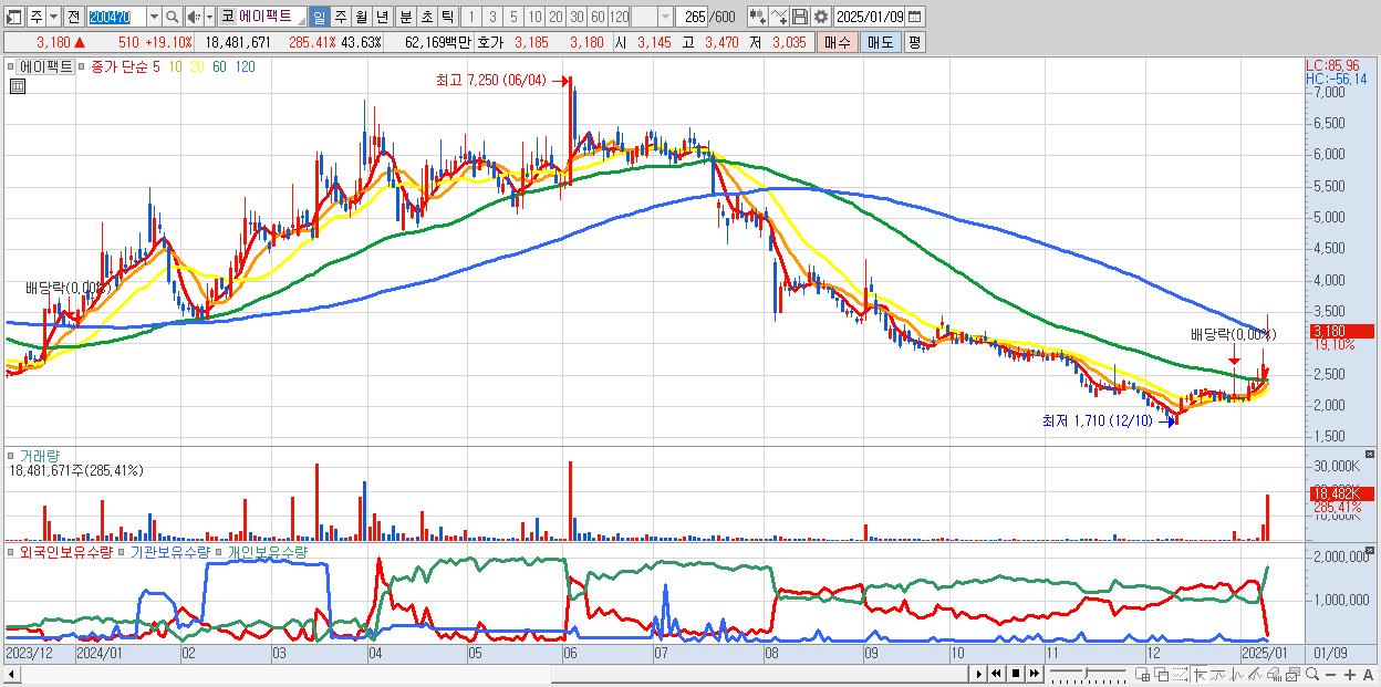 - 에이팩트 (3,180원 ▲ 19.1% , 시총: 1,347억, 거래량: 18,481,671, 거래대금:622억)