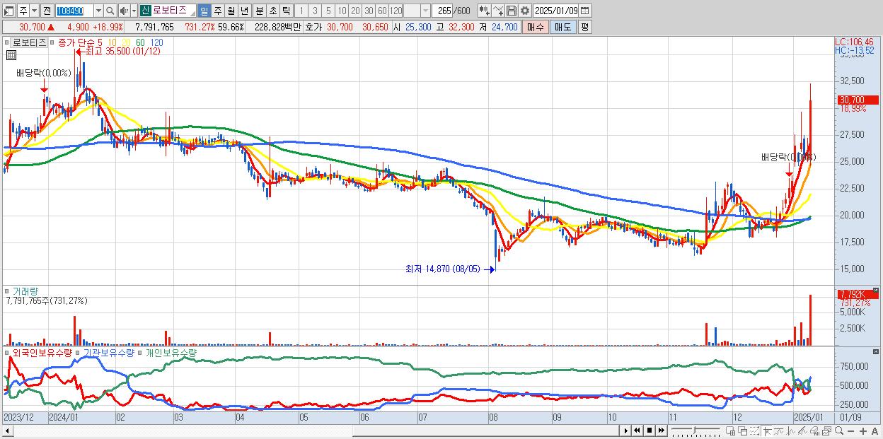 - 로보티즈 (30,700원 ▲ 18.99% , 시총: 4,010억, 거래량: 7,791,765, 거래대금:2,288억)