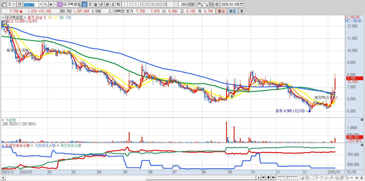 - 대구백화점 (7,700원 ▲ 15.1% , 시총: 833억, 거래량: 280,762, 거래대금:21억)
