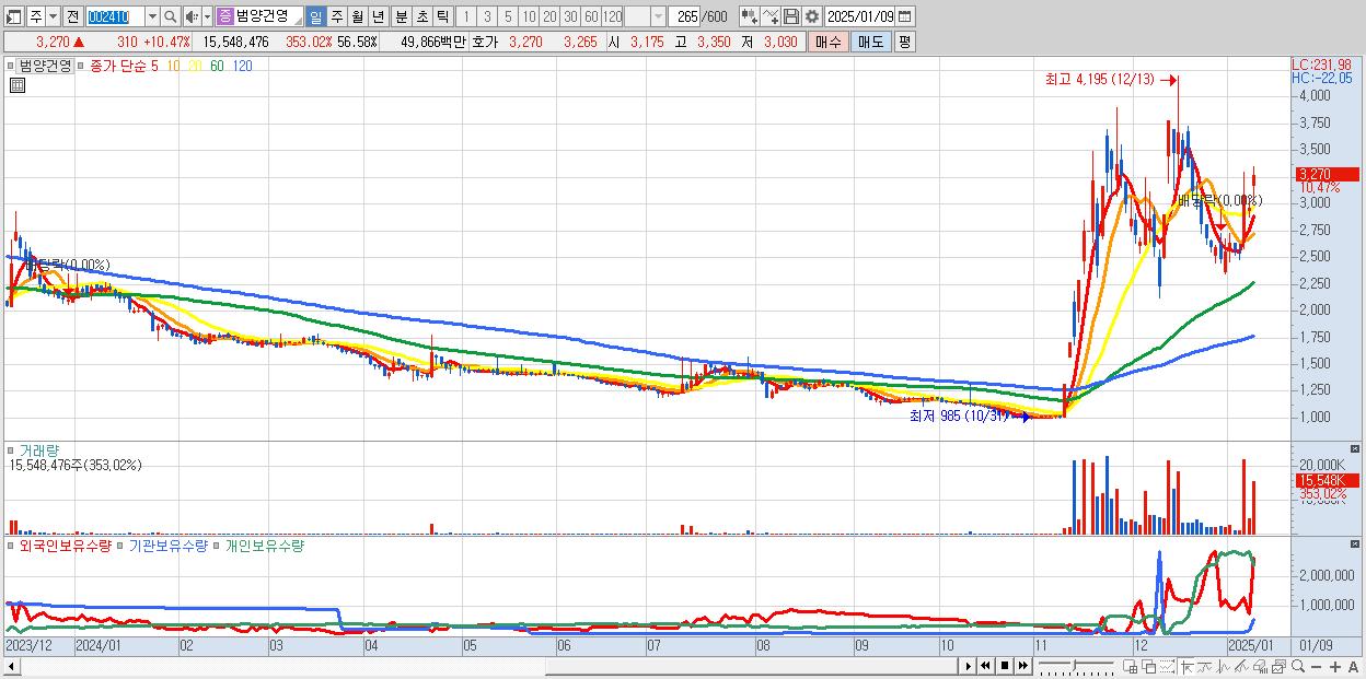 - 범양건영 (3,270원 ▲ 10.47% , 시총: 899억, 거래량: 15,548,476, 거래대금:499억)