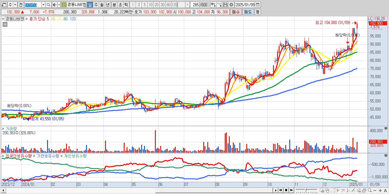 - 경동나비엔 (102,900원 ▲ 7.97% , 시총: 14,991억, 거래량: 200,383, 거래대금:202억, KOSPI)