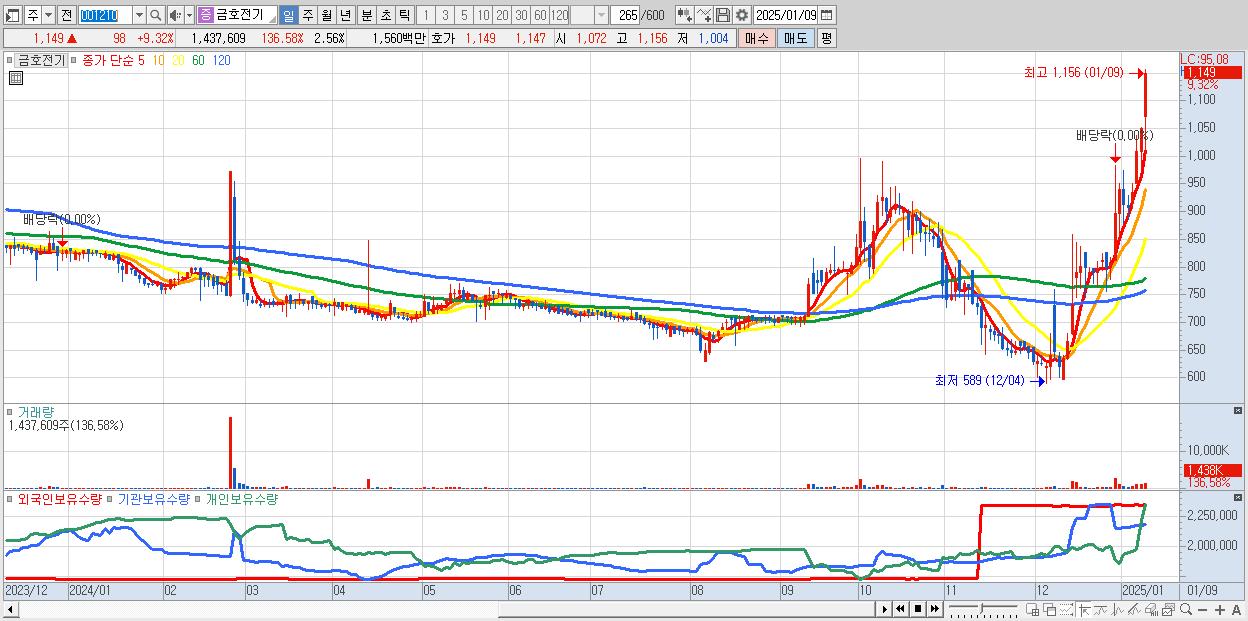 - 금호전기 (1,149원 ▲ 9.32% , 시총: 644억, 거래량: 1,437,609, 거래대금:16억, KOSPI)