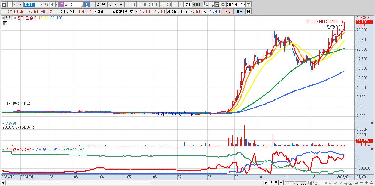 - 제닉 (27,150원 ▲ 8.6% , 시총: 2,163억, 거래량: 235,578, 거래대금:61억, KOSDAQ)