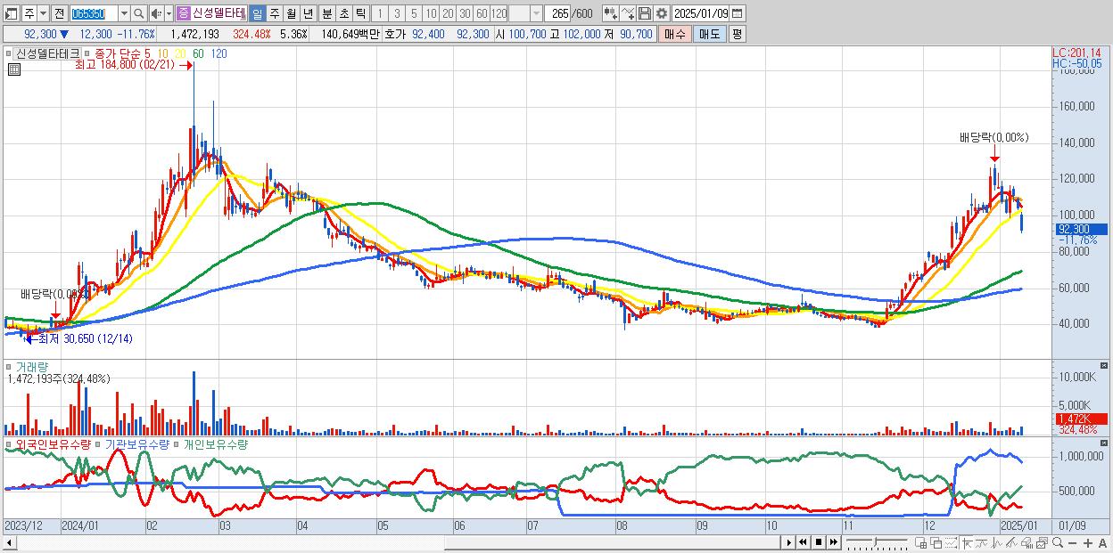 - 신성델타테크 (92,300원 ▼ -11.76% , 시총: 25,368억, 거래량: 1,472,193, 거래대금:1,406억)