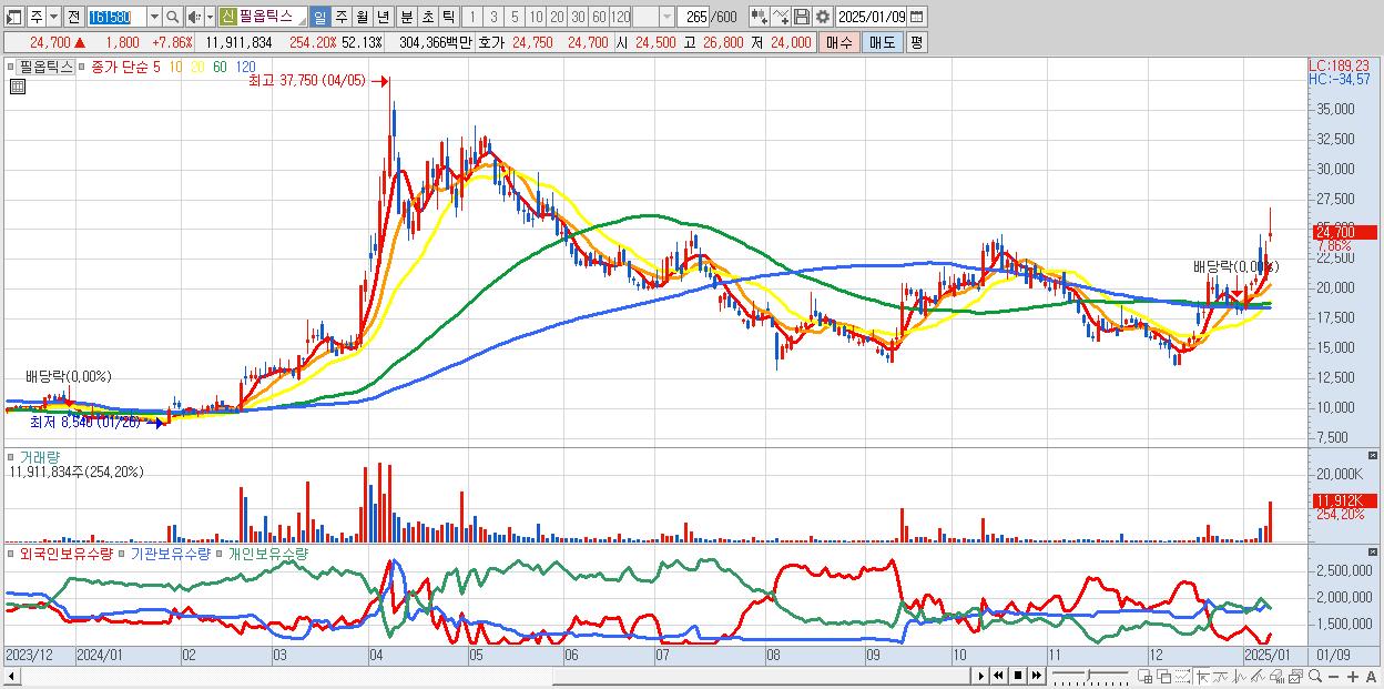 - 필옵틱스 (24,700원 ▲ 7.86% , 시총: 5,644억, 거래량: 11,911,834, 거래대금:3,044억)