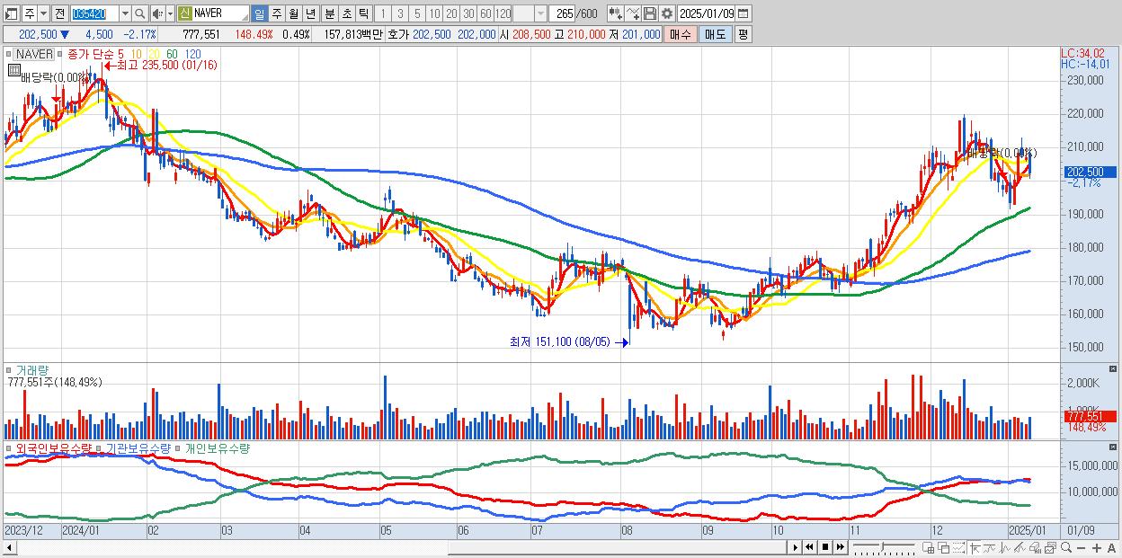 - NAVER (202,500원 ▼ -2.17% , 시총: 320,835억, 거래량: 777,551, 거래대금:1,578억)