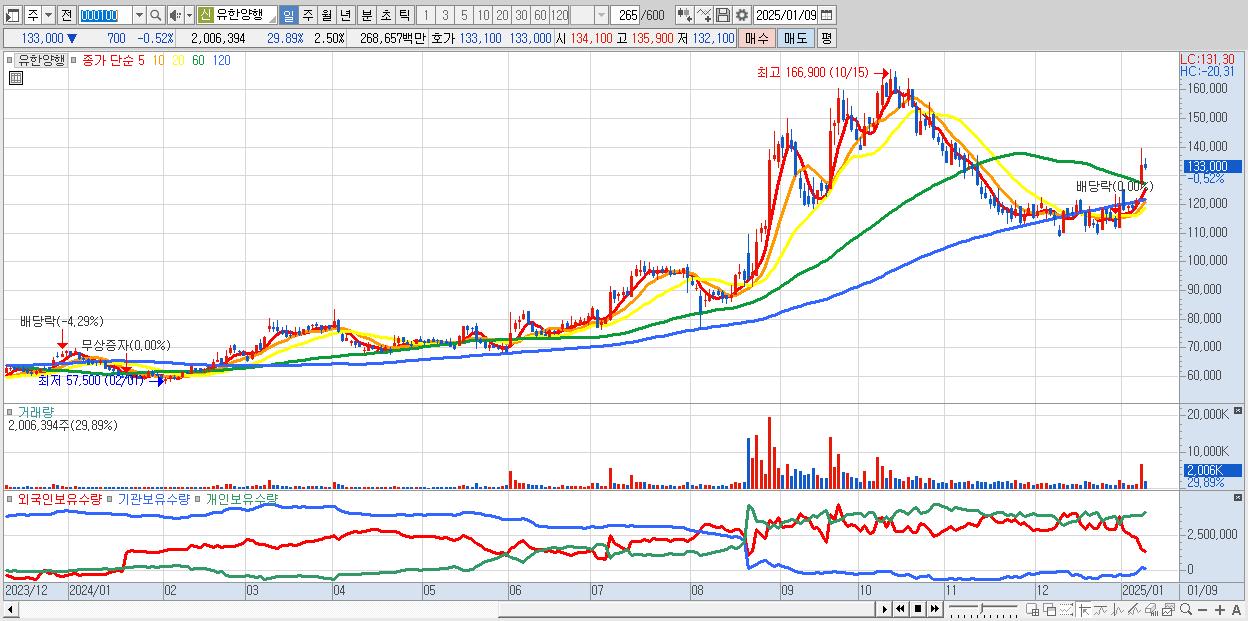 - 유한양행 (133,000원 ▼ -0.52% , 시총: 106,678억, 거래량: 2,006,394, 거래대금:2,687억)