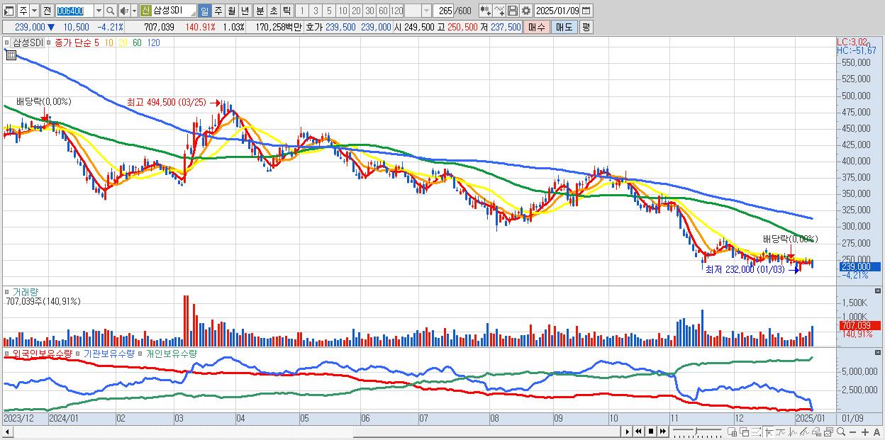 - 삼성SDI (239,000원 ▼ -4.21% , 시총: 164,347억, 거래량: 707,039, 거래대금:1,703억)