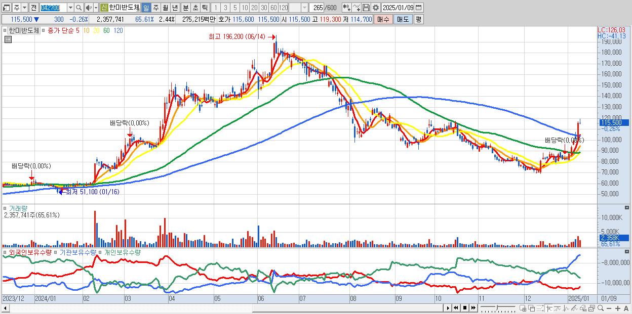 - 한미반도체 (115,500원 ▼ -0.26% , 시총: 111,589억, 거래량: 2,357,741, 거래대금:2,752억)
