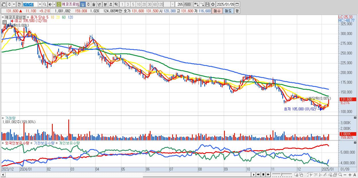 - 에코프로비엠 (131,600원 ▲ 9.21% , 시총: 128,707억, 거래량: 1,001,082, 거래대금:1,241억)