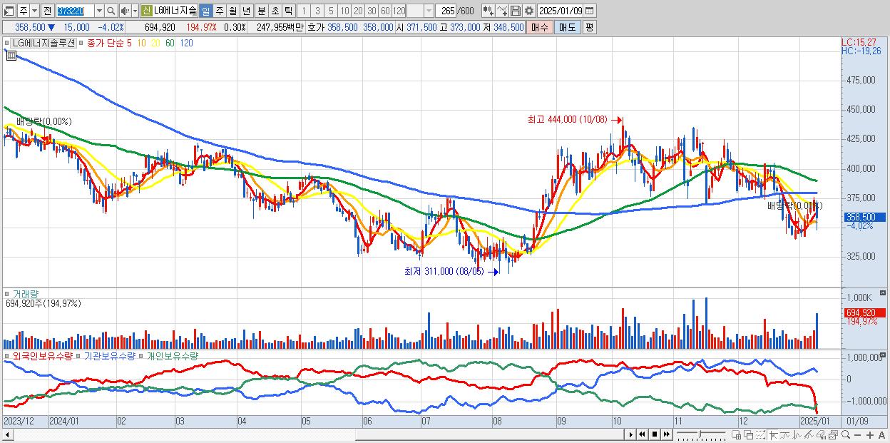 - LG에너지솔루션 (358,500원 ▼ -4.02% , 시총: 838,890억, 거래량: 694,920, 거래대금:2,480억)