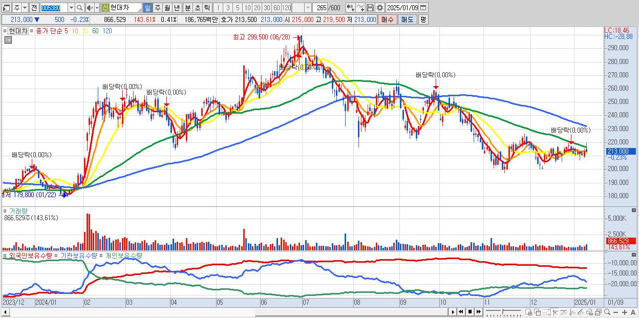 - 현대차 (213,000원 ▼ -0.23% , 시총: 446,056억, 거래량: 866,529, 거래대금:1,868억)