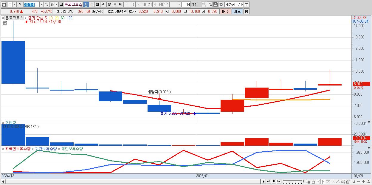 - 온코크로스 (8,910원 ▲ 5.57% , 시총: 1,057억, 거래량: 13,013,046, 거래대금:1,226억)