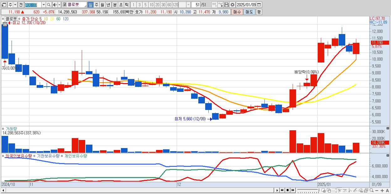 - 클로봇 (11,190원 ▲ 5.87% , 시총: 2,748억, 거래량: 14,288,563, 거래대금:1,557억)