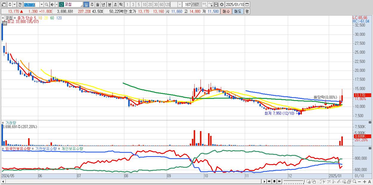 - 코칩 (13,170원 ▲ 11.8% , 시총: 1,120억, 거래량: 3,698,691, 거래대금:502억)