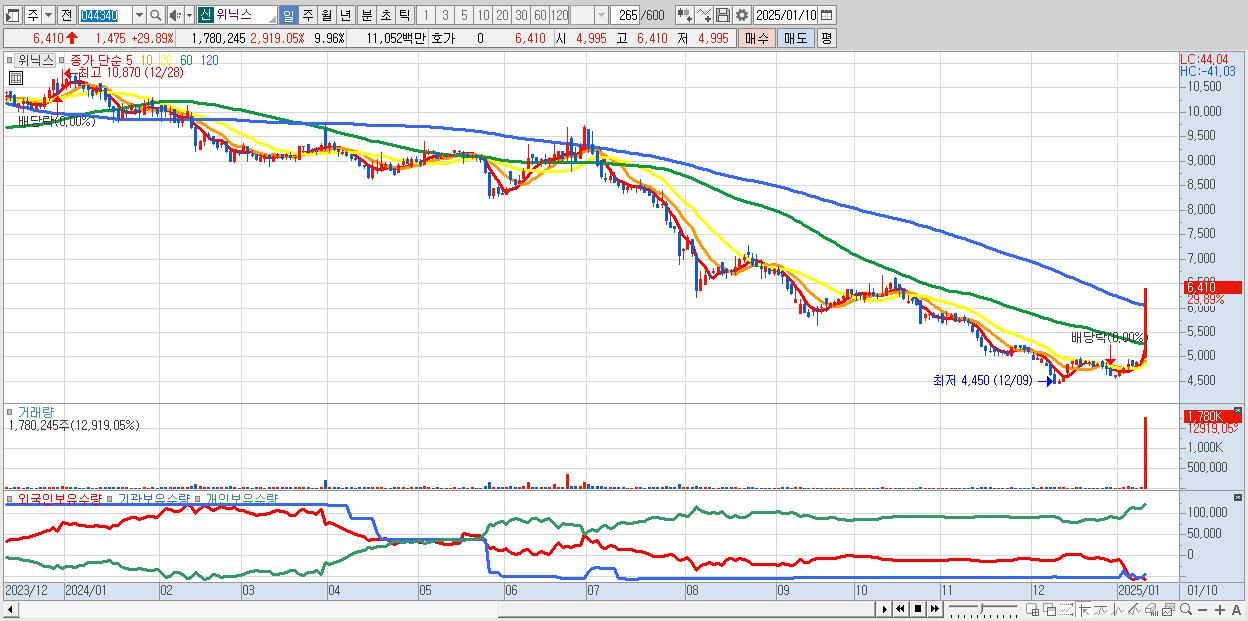 - 위닉스 (6,410원 ▲ 29.89% , 시총: 1,146억, 거래량: 1,780,245, 거래대금:111억)