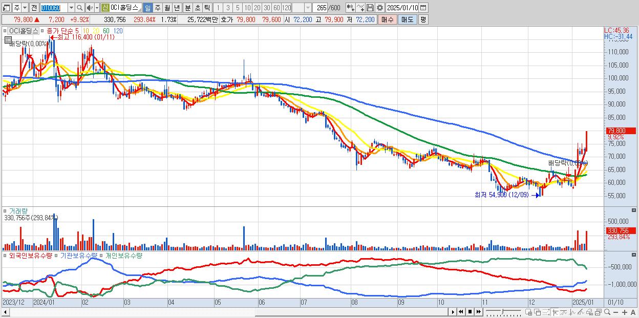 - OCI홀딩스 (79,800원 ▲ 9.92% , 시총: 15,264억, 거래량: 330,756, 거래대금:257억)