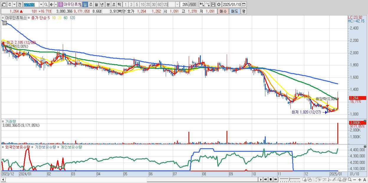 - 아우딘퓨쳐스 (1,264원 ▲ 16.71% , 시총: 450억, 거래량: 3,080,366, 거래대금:39억)