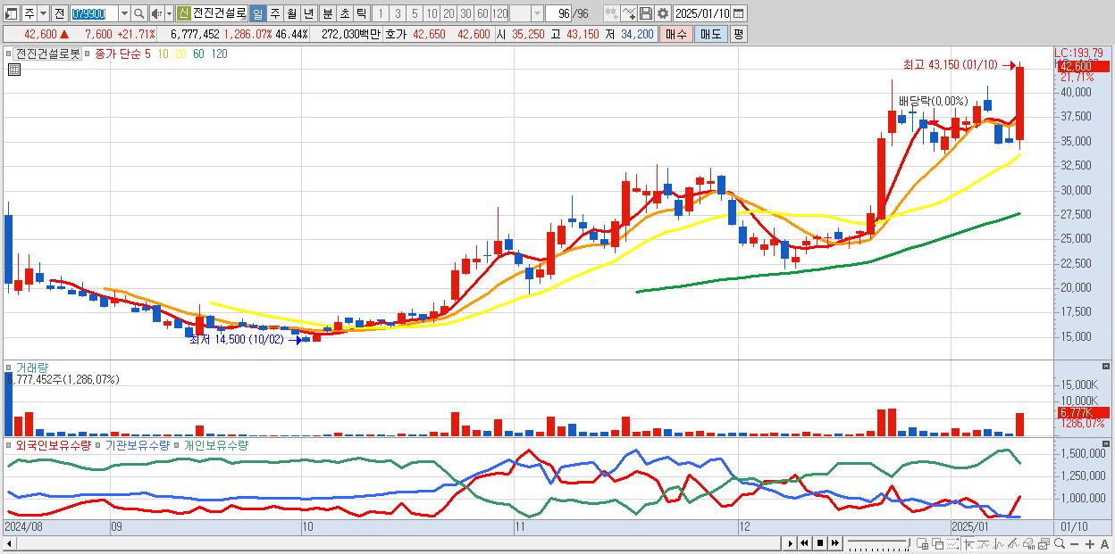 - 전진건설로봇 (42,600원 ▲ 21.71% , 시총: 6,216억, 거래량: 6,777,452, 거래대금:2,720억)