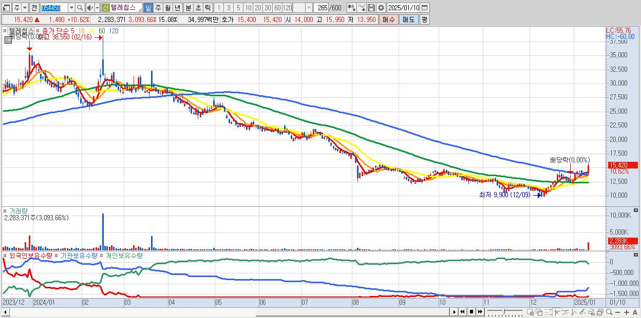 - 텔레칩스 (15,420원 ▲ 10.62% , 시총: 2,335억, 거래량: 2,283,371, 거래대금:350억)