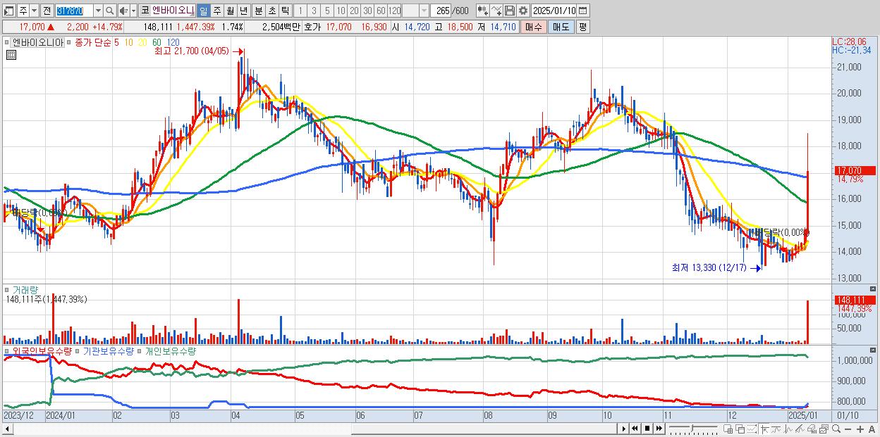 - 엔바이오니아 (17,070원 ▲ 14.79% , 시총: 1,452억, 거래량: 148,111, 거래대금:25억)