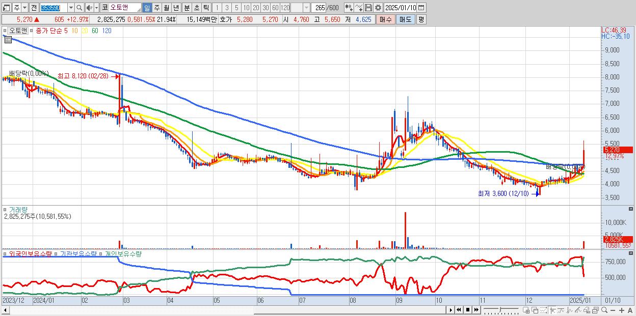 - 오토앤 (5,270원 ▲ 12.97% , 시총: 679억, 거래량: 2,825,275, 거래대금:151억)