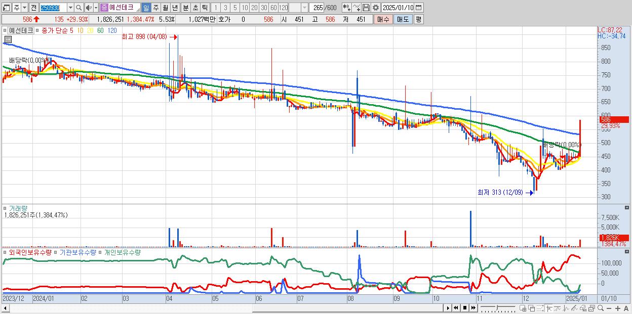 - 예선테크 (586원 ▲ 29.93% , 시총: 193억, 거래량: 1,826,251, 거래대금:10억)